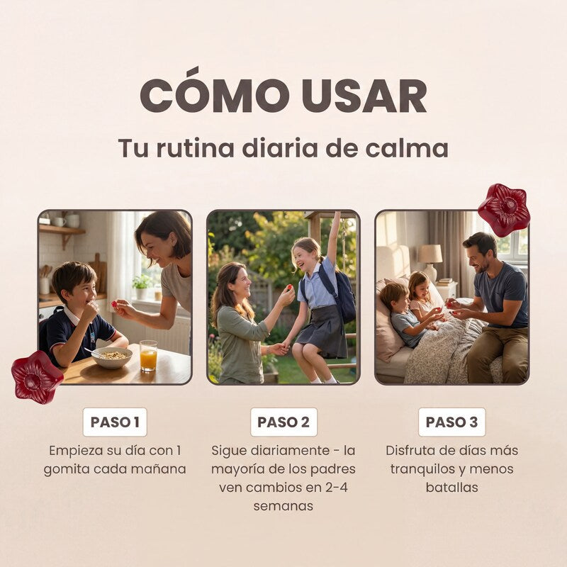 Los primeros cambios suelen notarse entre el día 3 y el final de la primera semana — una mañana un poco más tranquila, menos resistencia a la tarea, un berrinche que no escala como antes. Los cambios más claros aparecen entre la semana 2 y la semana 4: menos explosiones, mejor foco escolar, rutinas que empiezan a fluir. Con uso continuo durante 2 o 3 meses, esas mejoras se consolidan y se vuelven la nueva normalidad. La constancia es la clave — no te rindas en la primera semana.