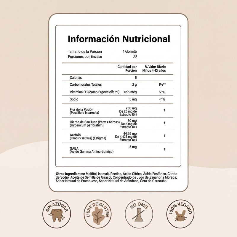 La fórmula combina azafrán clínico 10:1 — el único ingrediente natural con estudios que lo comparan favorablemente con el metilfenidato para el foco y la regulación emocional —, GABA para reducir el ruido mental y mejorar la concentración, pasiflora y hierba de San Juan para suavizar los picos emocionales, y vitamina D2 para el desarrollo neurológico. Todos de origen vegetal, sin azúcar, sin colorantes artificiales y sin ingredientes que generen dependencia.